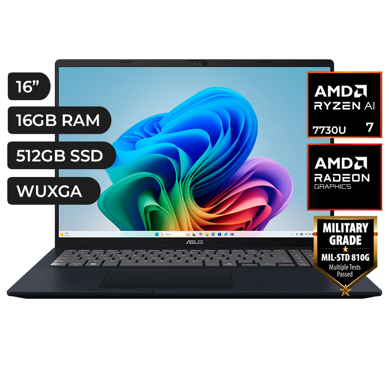 ASUS VIVOBOOK 16 M1607KA-MB050W, AMD RYZEN AI 7-350, RAM 16GB DDR5, SSD 512GB, AMD RADEON GRAPHICS, PANT. 16″ WUXGA IPS 60HZ, 3 CELDAS, WINDOWS 11 HOME, COLOR QUIET BLUE STAND-MILITAR