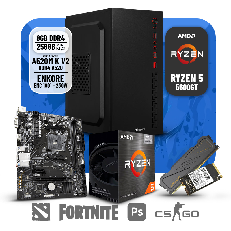 PC GAMER AMD RYZEN 5 5600GGT, RAM 8GB DDR4 HIKSEMI, SSD 256GB MINI M.2, CASE ENKORE KINGDOM ENC 1001 230W