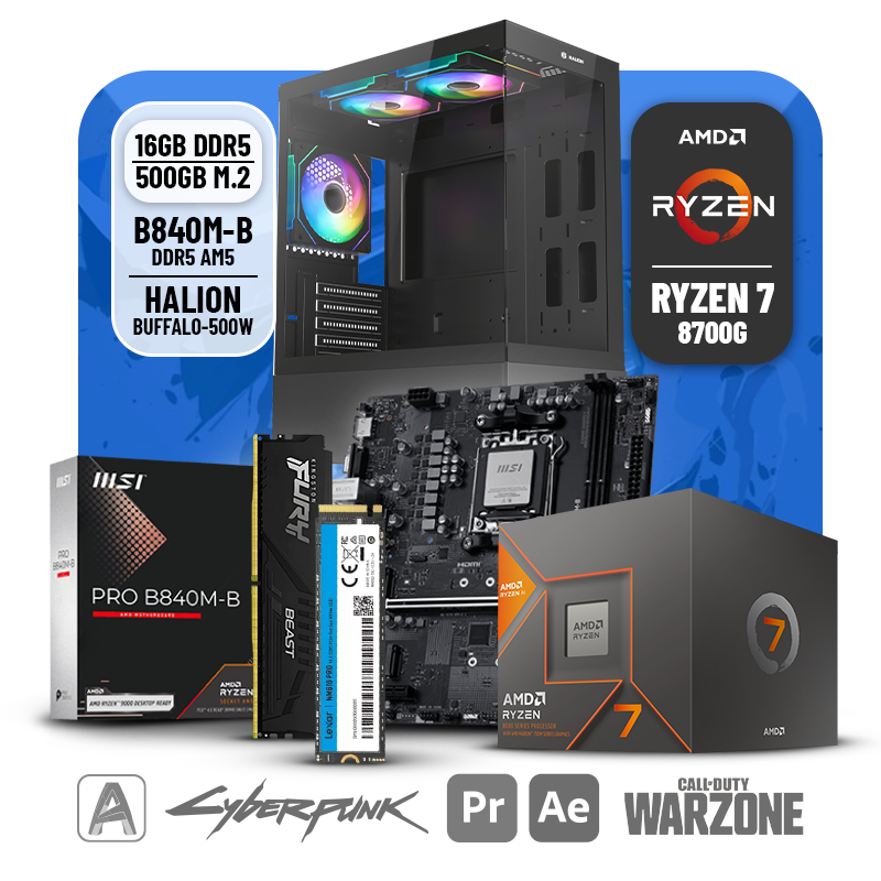 PC GAMER AMD RYZEN 7 8700G, RAM 16GB DDR5 5600MHZ KINGSTON, SSD 500GB LEXAR, CASE HALION BUFFALO