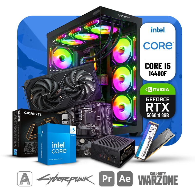 PC GAMER INTEL CORE I5 14400F, RAM 16GB DDR5 5600MHZ, GEFORCE RTX 5060TI 8GB, SSD 1TB 3300MB/s, CASE MICRONICS 6FAN ARGB, 750W 80+BRONZE